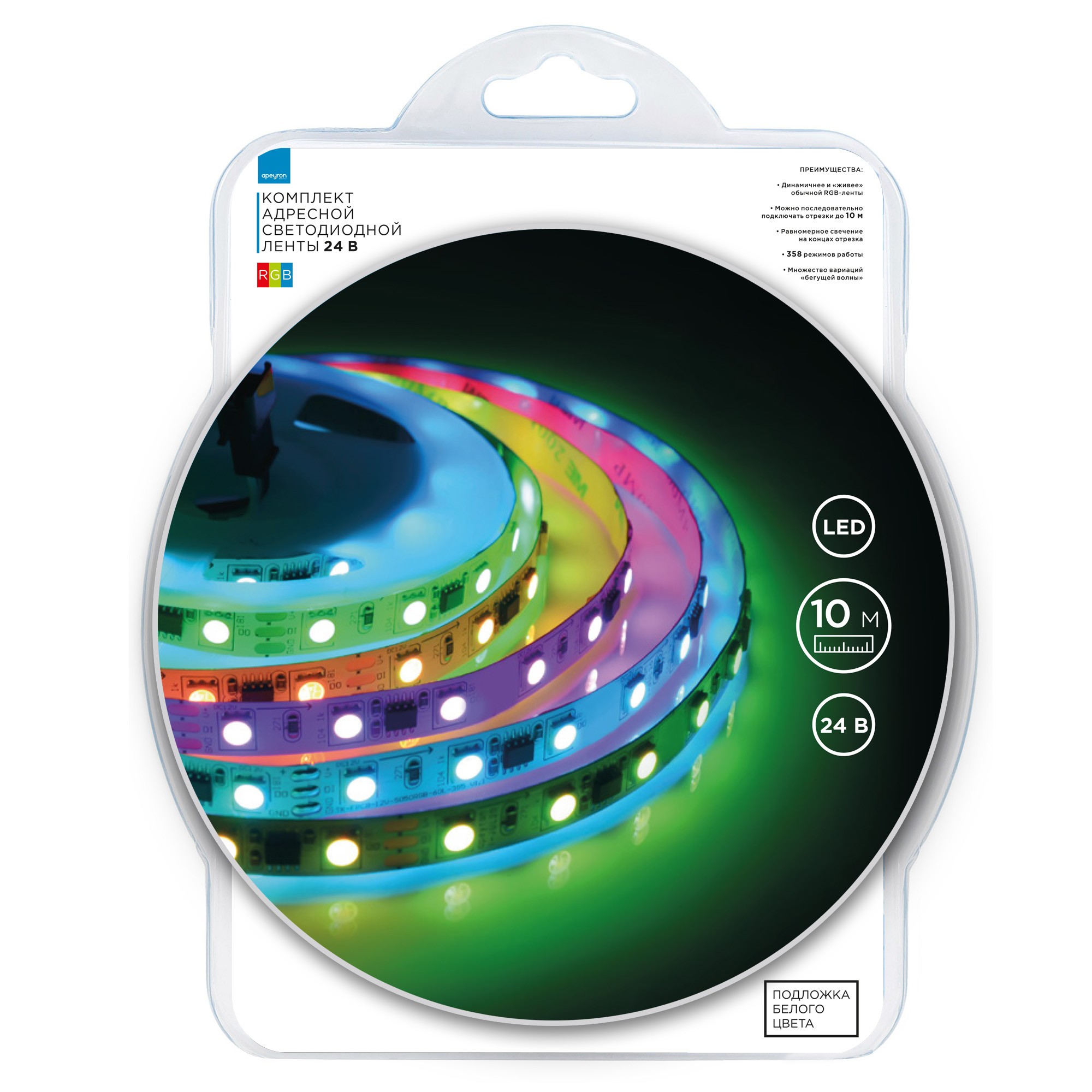 Комплект адресной светодиодной ленты Apeyron 24В 14,4Вт/м smd5050 60д/м IP20 10м RGB (адаптер питания, контроллер) 10-99✖Добавить к сравнениюПерейти к сравнению