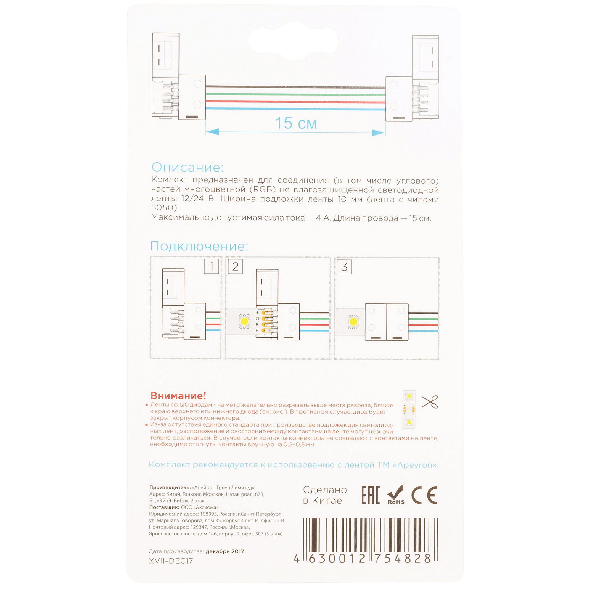 Комплект коннекторов Apeyron (2 клипсы с проводами) для RGB-светодиодной ленты 12В IP20подложка 10мм 09-12✖Добавить к сравнениюПерейти к сравнению