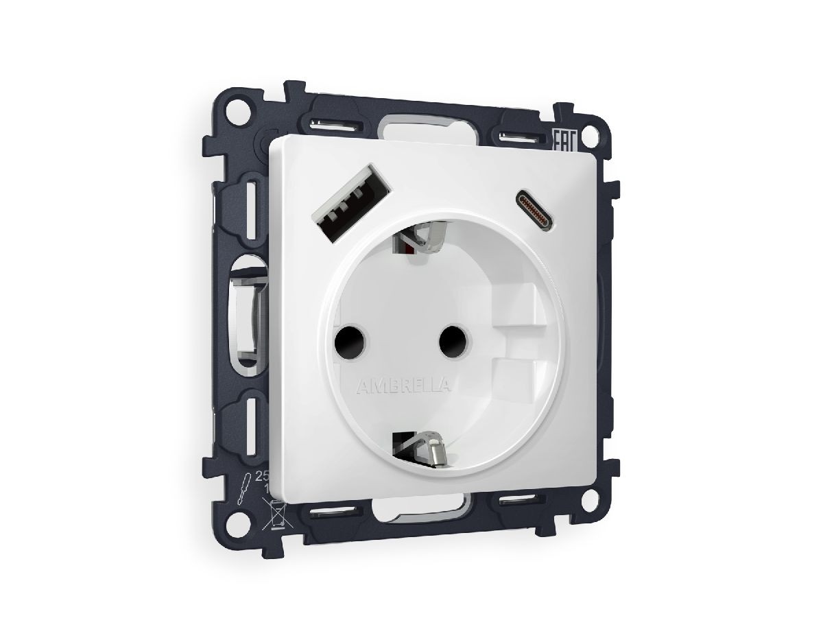 Комплект механизма розетки 2USB A+C 20W (быстрая зарядка) с/з Ambrella Volt Alfa MA130010✖Добавить к сравнениюПерейти к сравнению