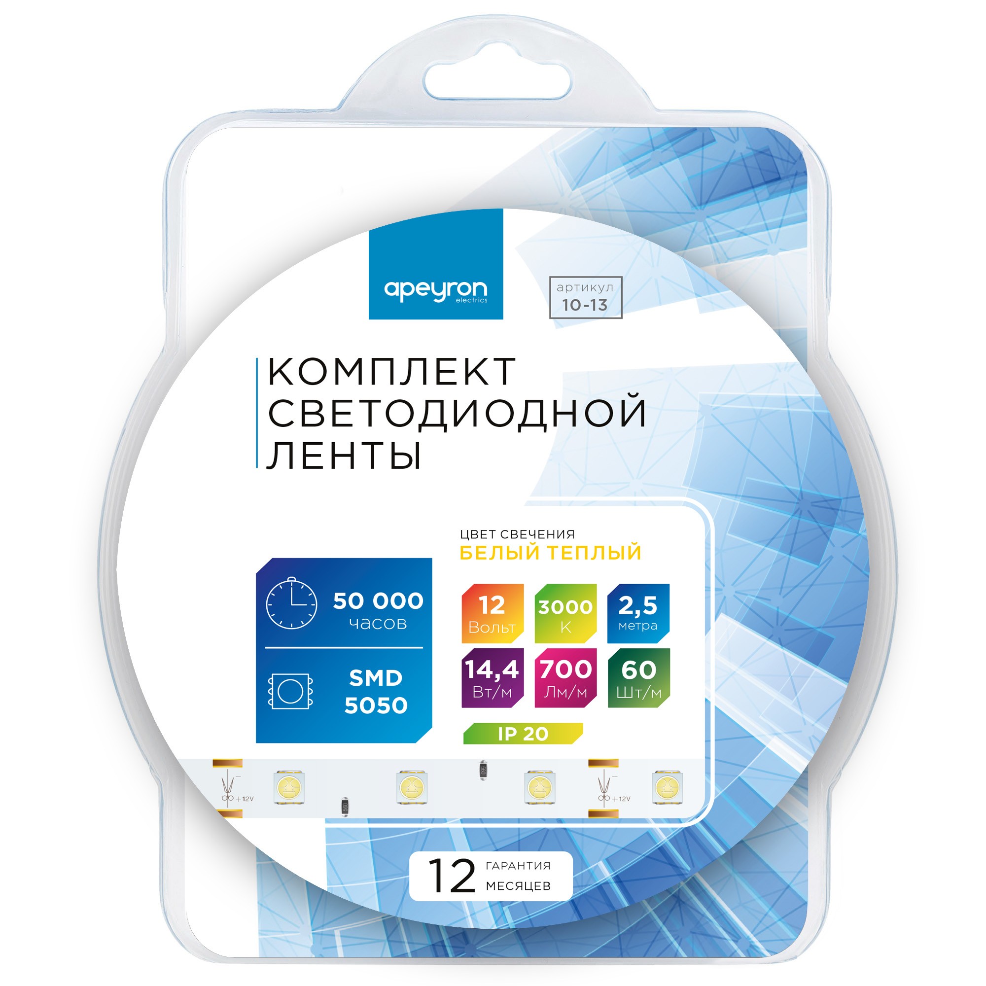 Комплект светодиодной ленты Apeyron 12В 14.4Вт/м smd 5050 60 д/м IP20 2,5м 3000K (блок, коннектор) 10-13✖Добавить к сравнениюПерейти к сравнению