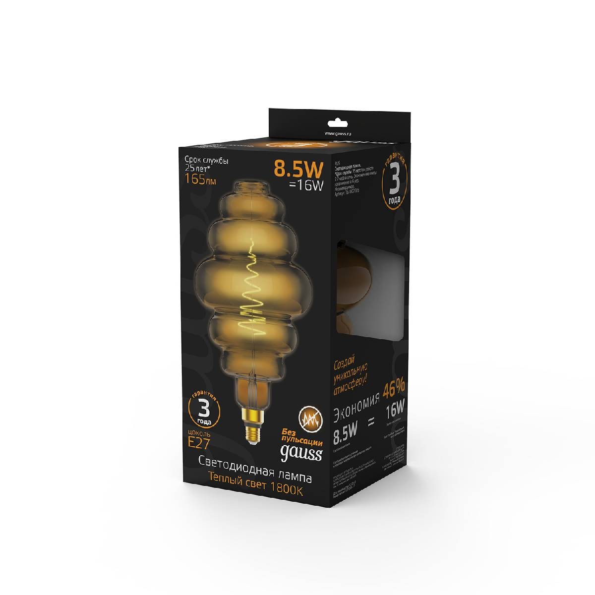 Лампа светодиодная филаментная Gauss E27 8,5W 1800K серая 161802005✖Добавить к сравнениюПерейти к сравнению