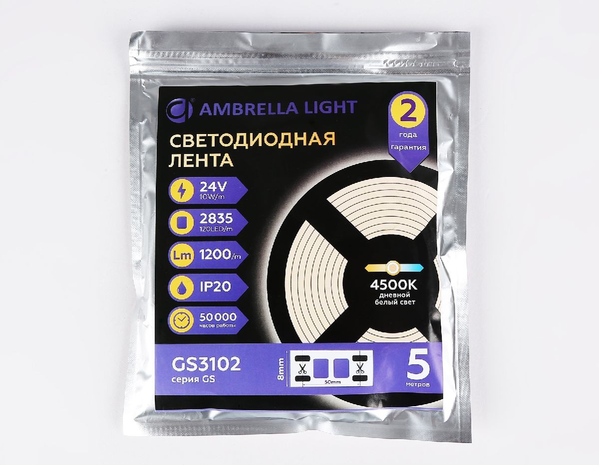 Светодиодная лента Ambrella Light LED Strip 24В 2835 10Вт/м 4500K 5м IP20 GS3102✖Добавить к сравнениюПерейти к сравнению