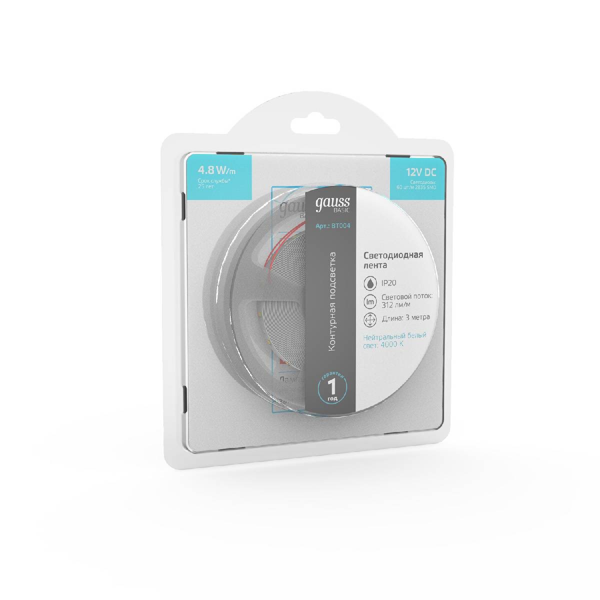 Светодиодная лента Gauss 12В 2835 4,8Вт/м 4000K 3м IP20 BT004✖Добавить к сравнениюПерейти к сравнению