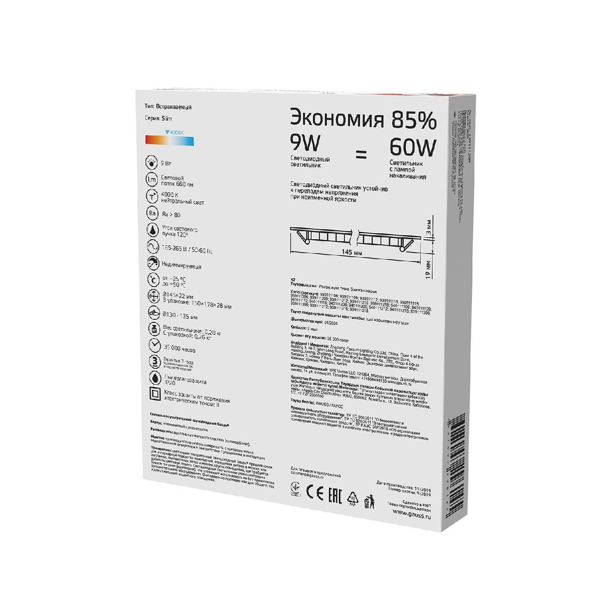 Мощность лампы, W | 9 |